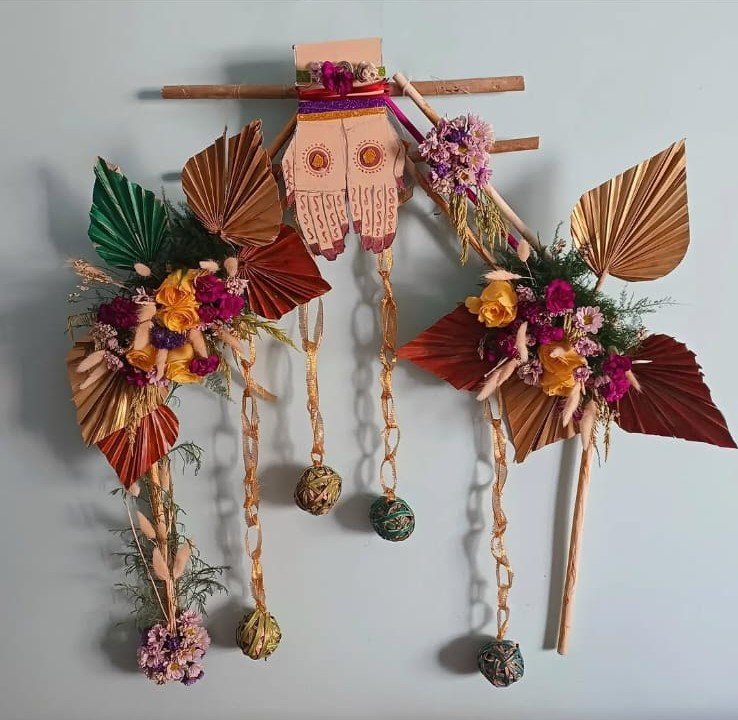 Colorful structure of Reed sticks with colorful dry material such as dried palm leaves and cane balls blend well with the structure and depicts dryness of Mehendi with color. Yellow roses with purple spray carnation and mingling small light pink Chrysanthemum makes mood lively and happy for the bright event. The poking delicate dry cones add more interest in design. Celosia and Limonium fill freshness. Hand cutout with corsage and bangle itself marks event purpose. It is a quite economic and meaningful decor.